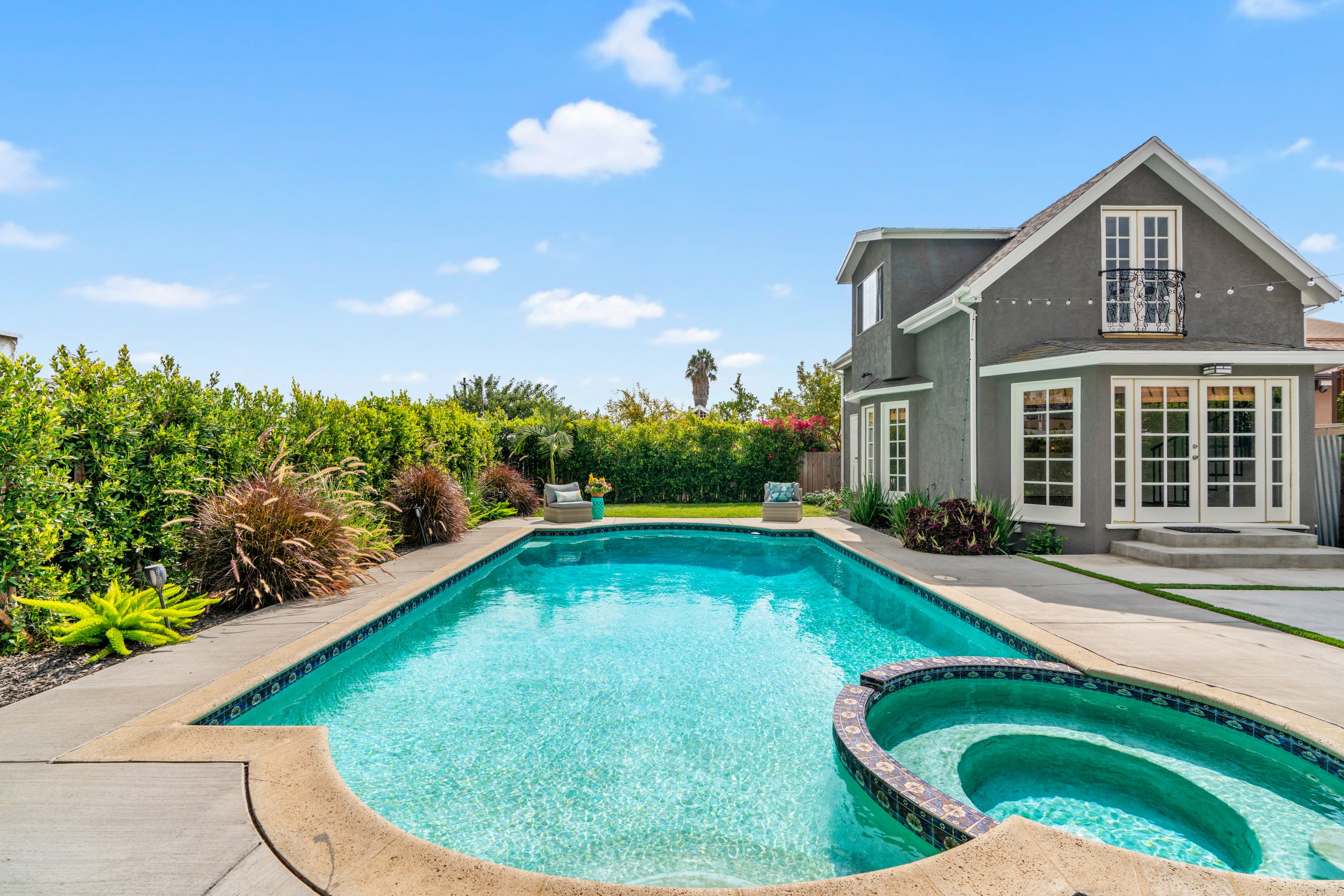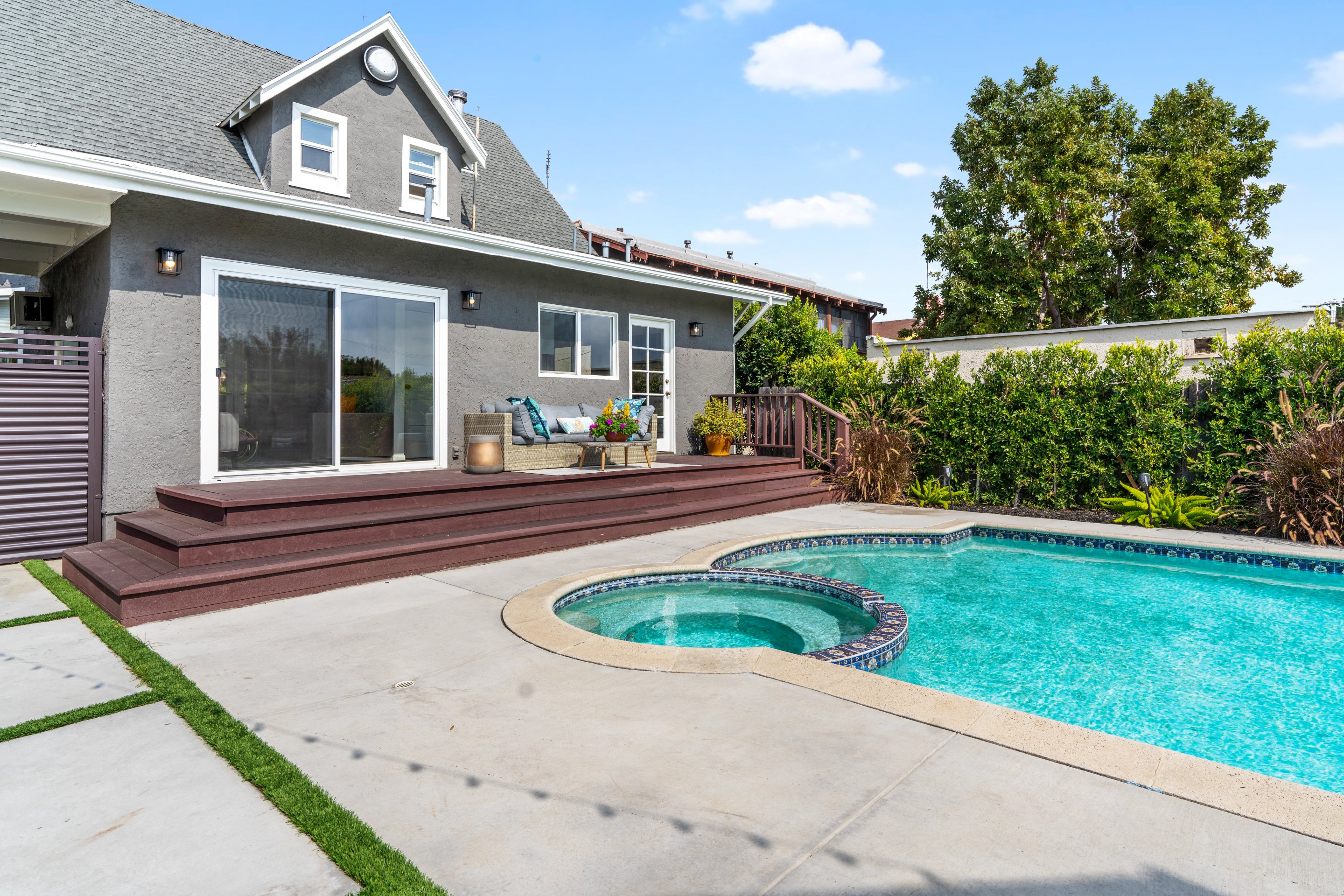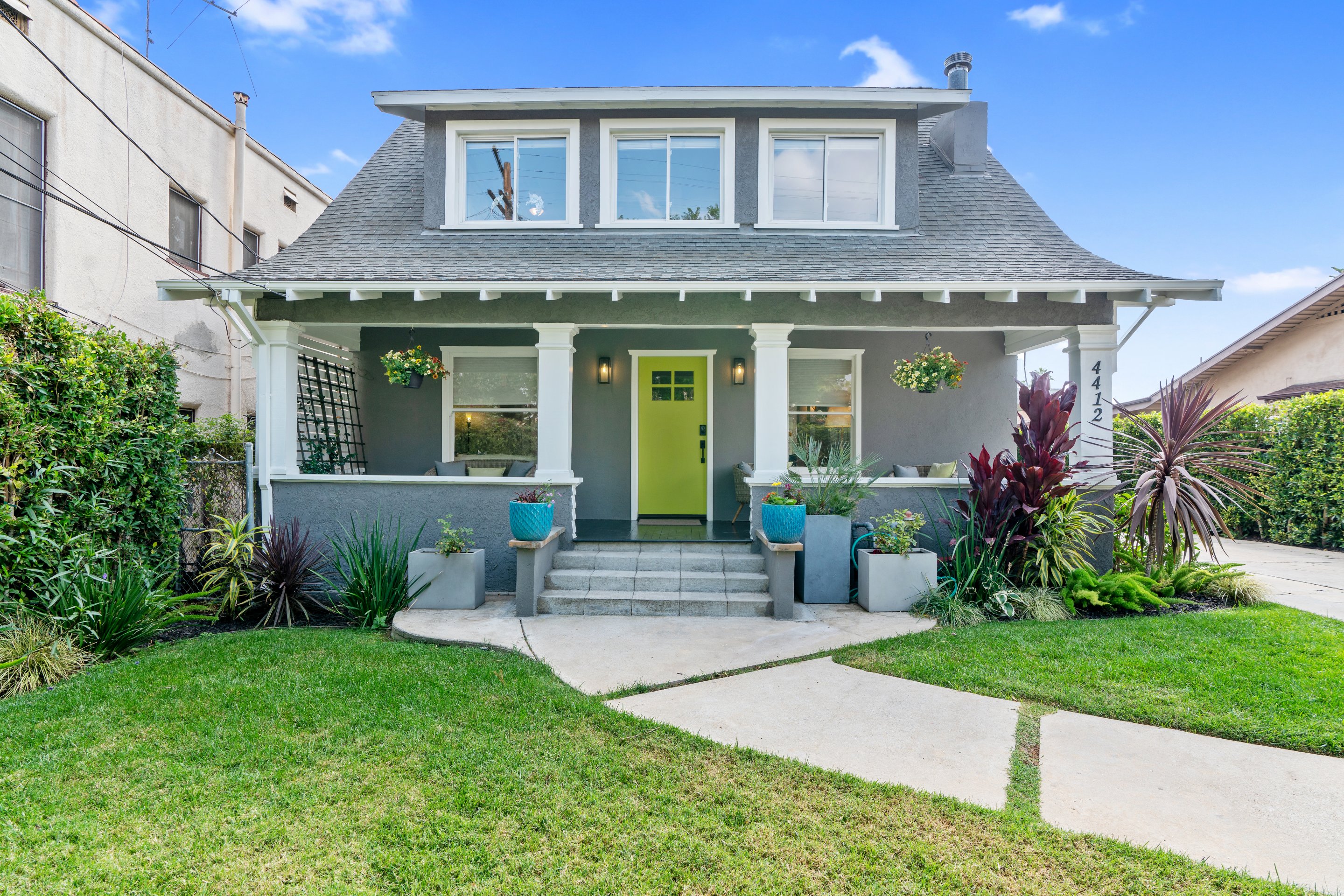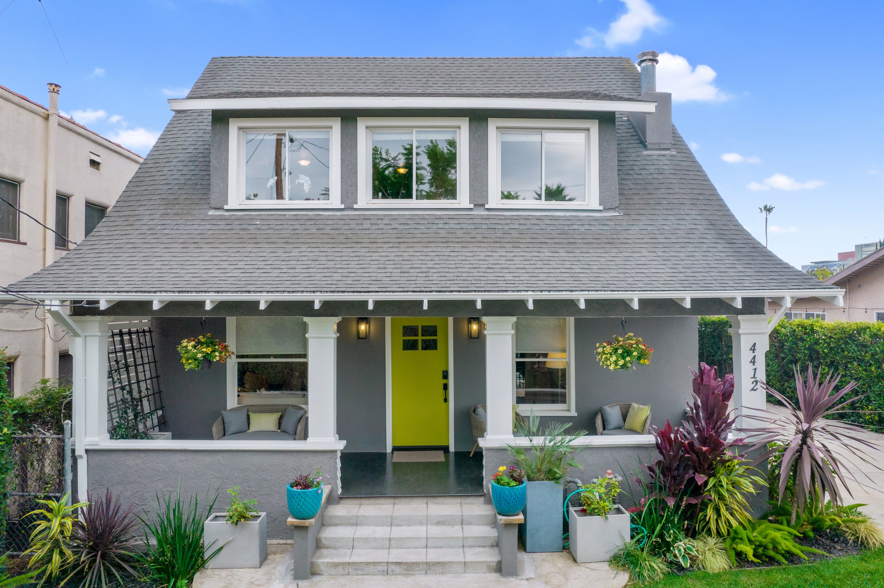 In Los Feliz, hidden behind mature landscaping and wrought iron fence/gate, sits this 1910 California Craftsman with original architectural details such as refinished hardwood floors, millwork, windows, and wall sconces still intact. The kitchen has recently been updated with Quartzite countertops and a Carra marble backsplash. The plate rail in the dining room sets the tone for a beautiful dinner party in the spacious and formal room replete with the original pocket doors. The large living room off the covered front porch has an abundance of natural light thru the picture windows. Three bedrooms upstairs, 2 with ensuite bathrooms one with a claw foot tub. The garage has been converted to an 879 sq ft 2 story guesthouse with a kitchenette, bedroom, and 2 bathrooms. Views of the landmark Hollywood sign and the Griffith Observatory from the guest house Juliet balcony. The large backyard has a pool and spa with multiple outdoor areas to relax and dine