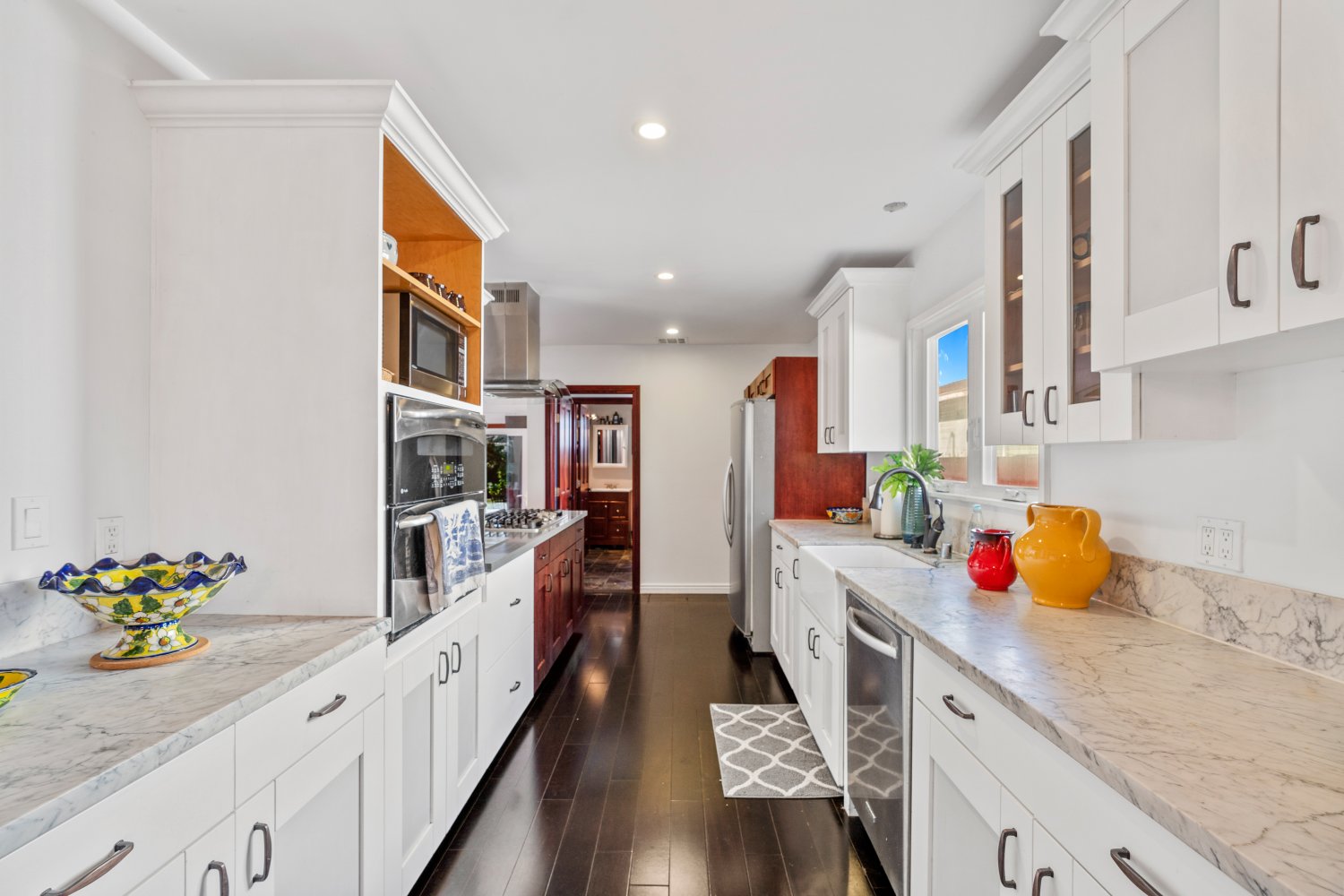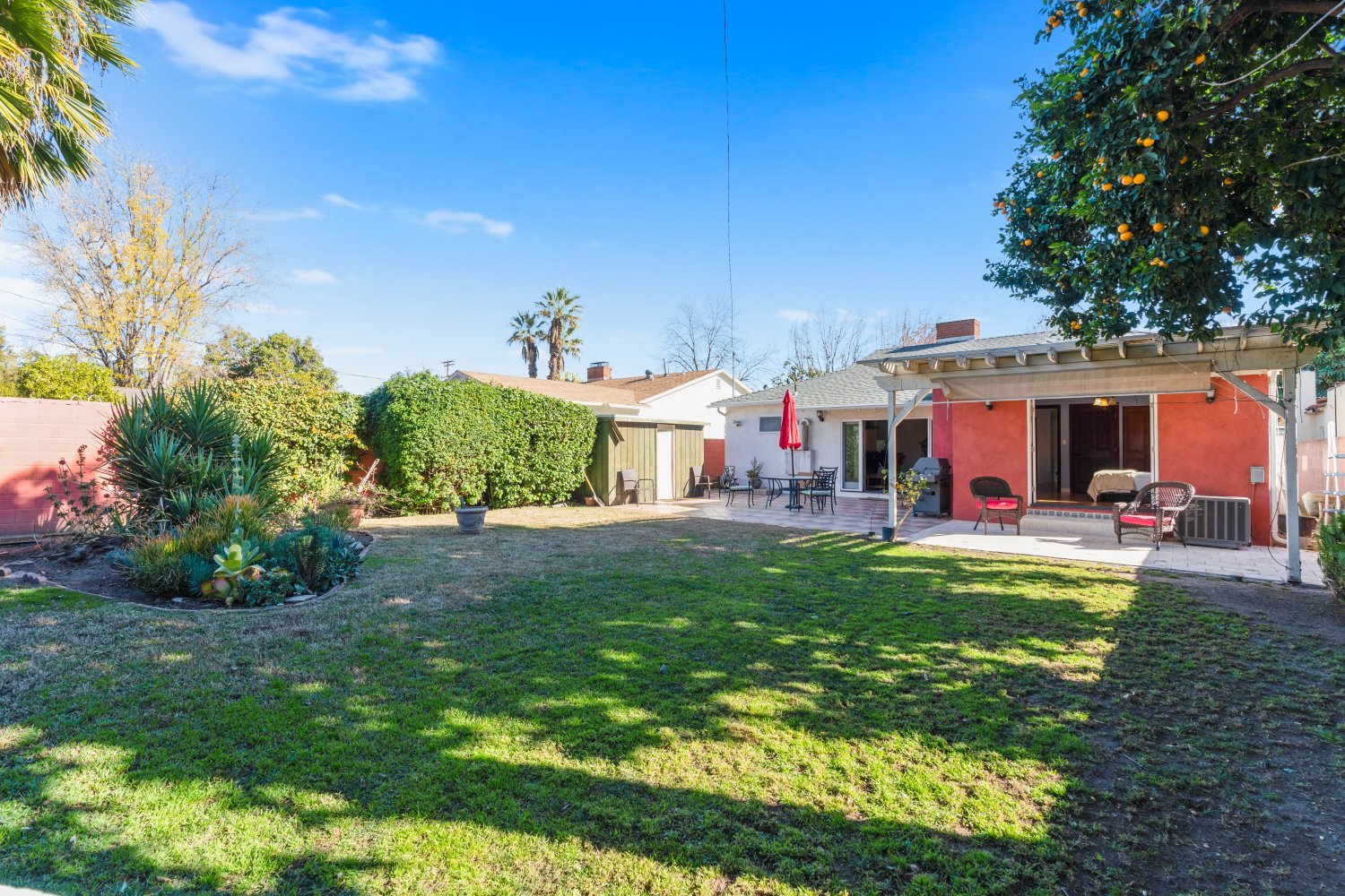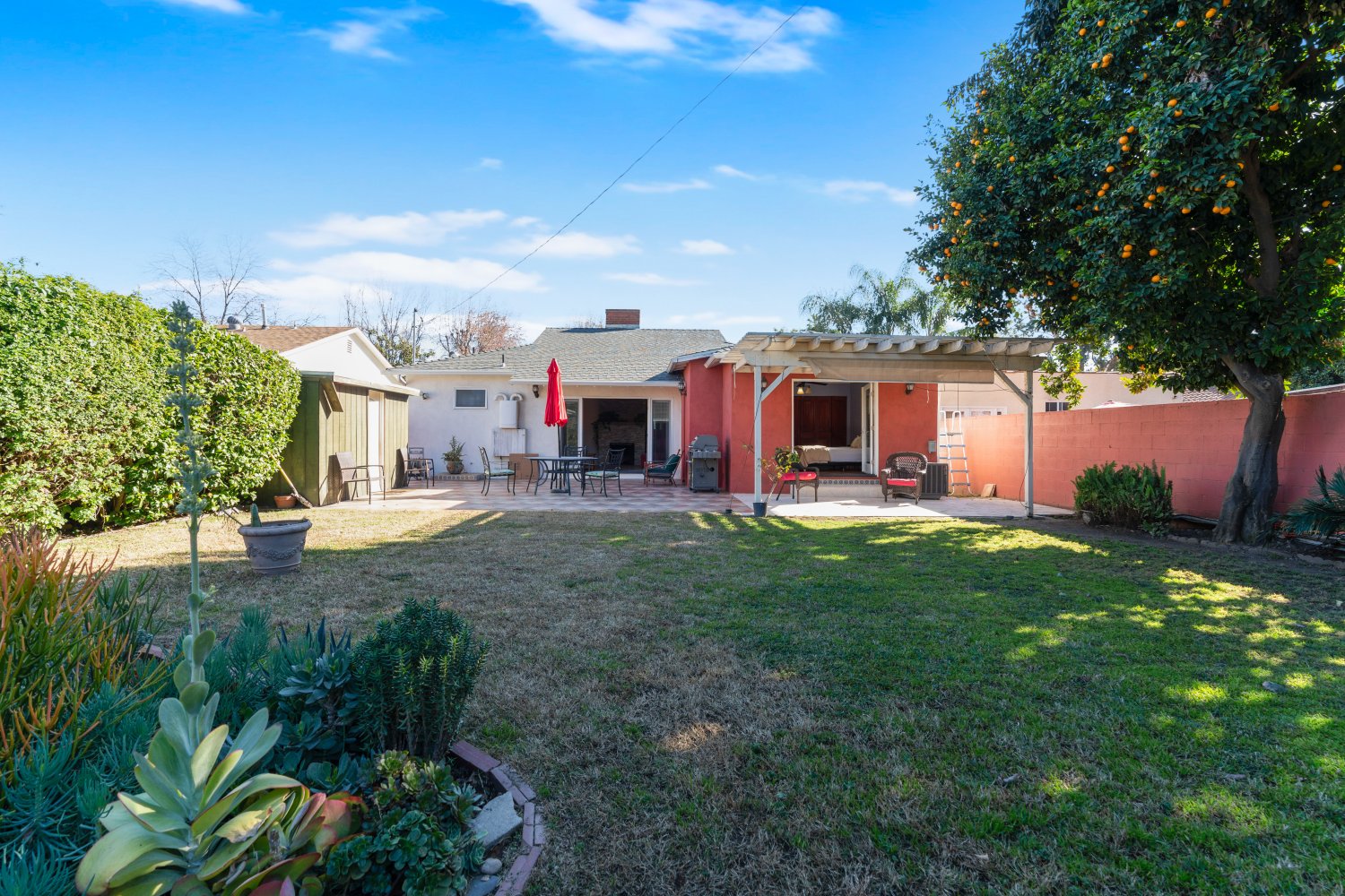 Awesome 3 bed, 3 bath house, almost completely rebuilt in 2013, with private attached studio for home office/music studio/workout room, plus small kitchenette & bathroom, & french doors leading to private front yard. Both living room and family room have fireplaces. Newer kitchen with marble countertops, double wall convection oven, cooktop, pantry + plenty of storage space with breakfast bar & granite island. Laundry with utility sink. Vaulted ceiling in family room, with French doors leading to large patio. Master suite has 2 sets of closets, jetted bathtub, double sinks & french doors leading to private patio. New plumbing, new electrical, new wiring & newer tankless water heater. Hardwood floors throughout. Family room has travertine flooring. recessed lighting, central air & heat & ceiling fans, marble tiles, avocado & orange trees & grassy yard. Plenty of street & driveway parking. Close to Westfield Mall & shopping & dining. One block from bike path - easy access to freeways.